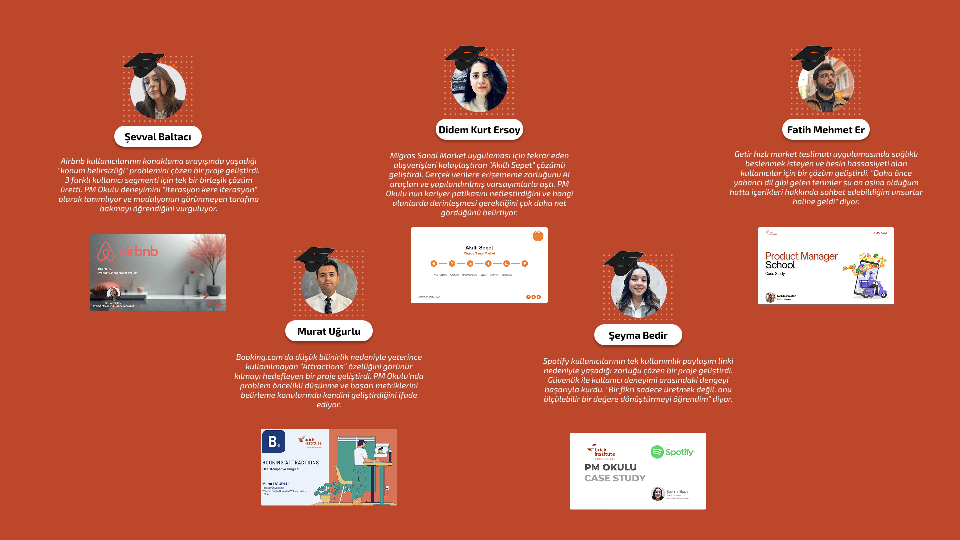 Final projeleri gerçek kullanıcı problemlerini ele aldı. Kullanıcı araştırmasıyla başladı, hipotez geliştirme ve MVP tanımlamadan geçti, başarı metrikleriyle olgunlaştı. Sadece teori değil, uygulama. Sadece fikir değil, gerçek çıktılar.