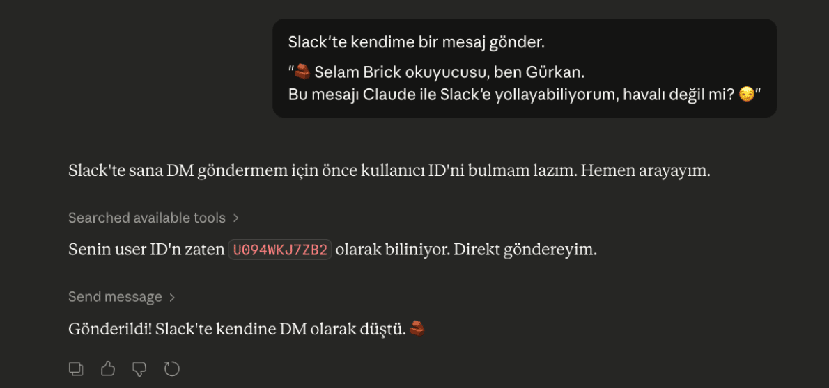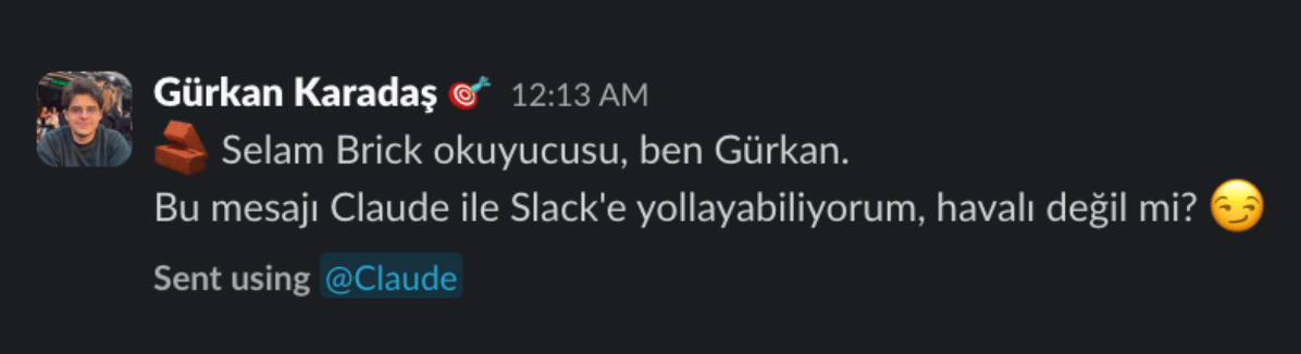 MCP ile Slack’e mesaj gönderdiğimizde ise böyle gözüküyor.