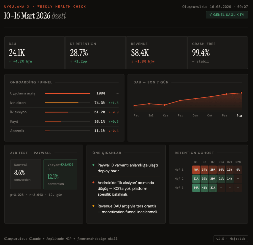 Amplitude'den metrik verisini çekiyorum, Claude analiz ediyor. Tartışıyoruz, veriyi onaylıyorum.